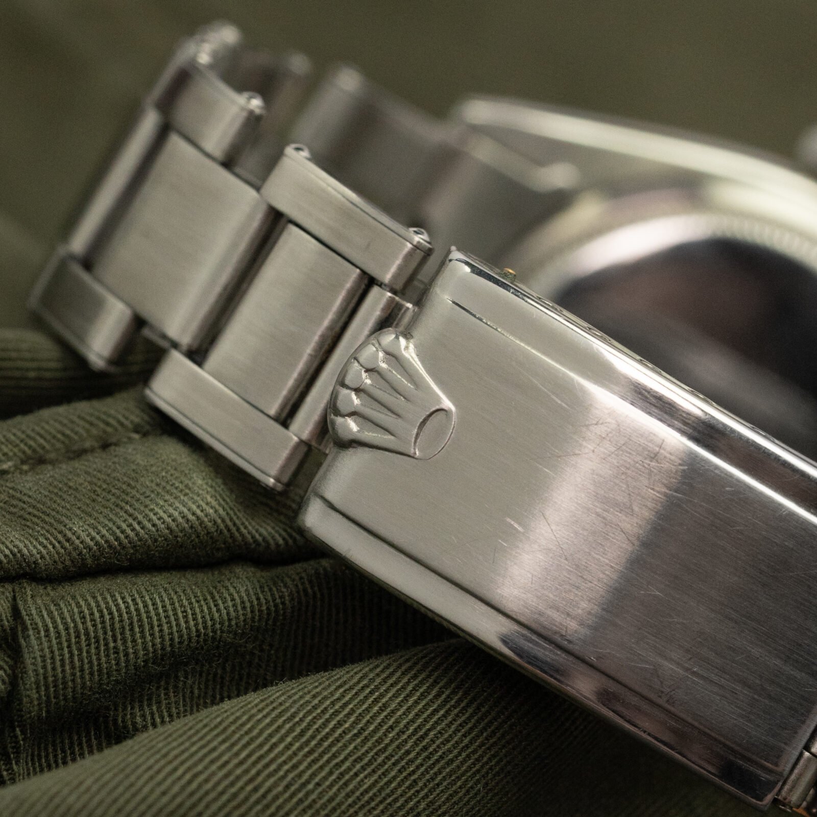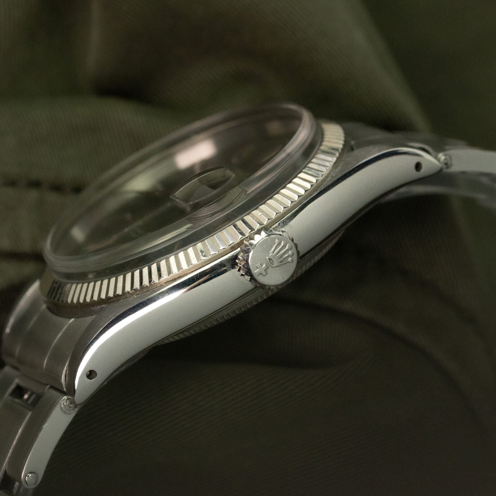 Measuring 36mm, the stainless steel Oyster case retains the thinner, fluted bezel that gives early Datejusts their distinctive character. The watch is fitted with a riveted Oyster bracelet, completing the period-correct configuration.