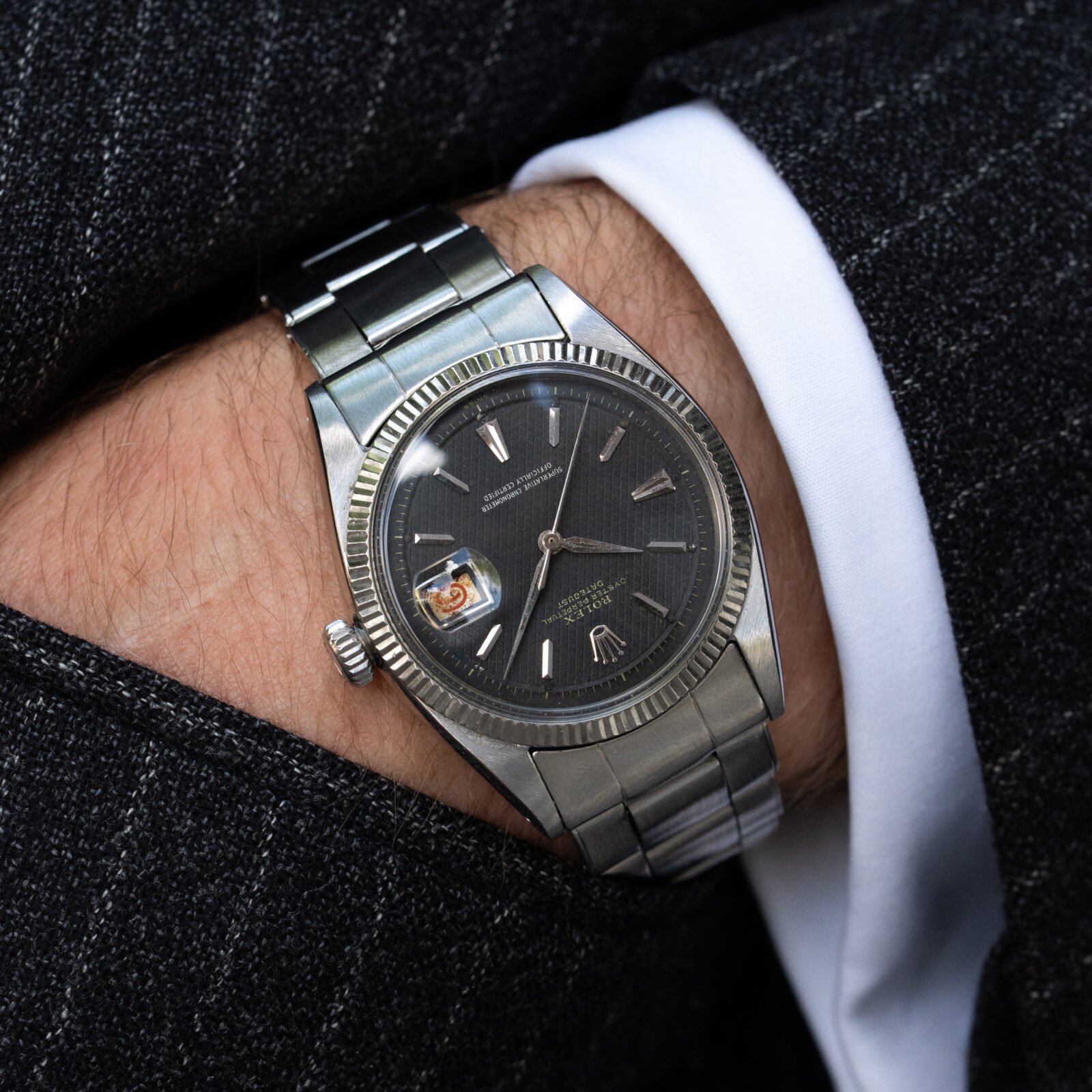 The example we are offering dates to 1956 and features one of the most charismatic dial executions of the period: a black waffle-textured dial that plays with light in a way flat surfaces never could. The applied arrowhead indexes and dauphine hands add sharp mid-century elegance, while the roulette date disc (alternating between red and black numerals) provides a subtle but playful detail that has become a collector’s favorite.